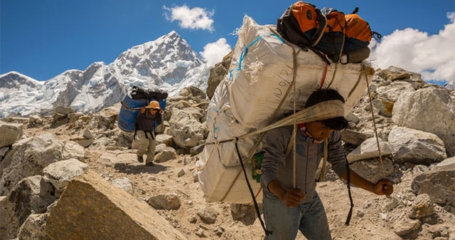 Người Sherpa khuân vác mang hàng hóa từ trang trại trên đỉnh Everest (cao nhất thế giới) xuống các ngôi làng ở Gorak Shep, Nepal để cất giữ. Trải qua hàng nghìn năm sống ở vùng cao, họ đã có được những đột biến gene cho phép họ sử dụng oxy hiệu quả hơn.