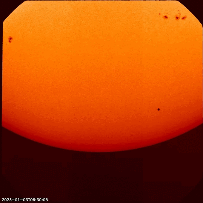 Chấm đen chuyển động trong video này là sao Thủy đi qua Mặt trời vào ngày 3/1/2023