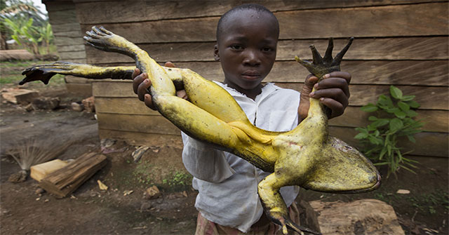 Ẩm thực châu Phi luôn khiến cho mọi người ngạc nhiên, thậm chí có phần khiếp sợ. Đặc biệt có một số động vật ở nước ta thì có kích thước bình thường, nhưng ở châu Phi thì lại lớn gấp nhiều lần, nổi bật nhất phải kể đến loài ếch. Loài ếch này có tên là Goliath, có thể sống cả dưới nước lẫn trên cạn. Goliath được các nhà sinh vật học xác nhận là loài ếch lớn nhất trên thế giới.
