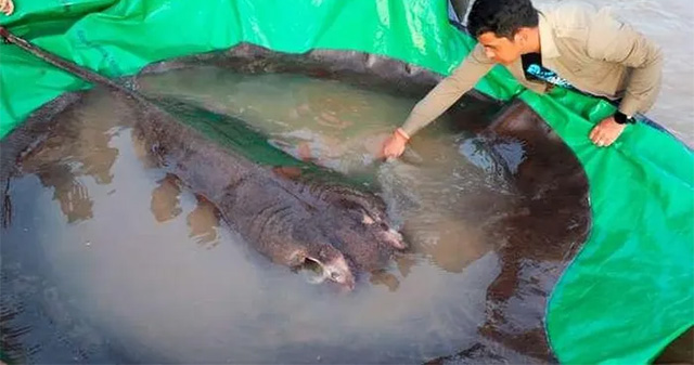 Ngư dân Moul Thun, 42 tuổi, bắt được con cá đuối gai độc khổng lồ dài gần 4 m, nặng khoảng 300 kg vào tối 13-6 gần hòn đảo xa trên sông Mekong ở vùng Stung Treng, theo tuyên bố của Wonders of the Mekong (dự án nghiên cứ hợp tác Campuchia – Mỹ) ngày 20-6.