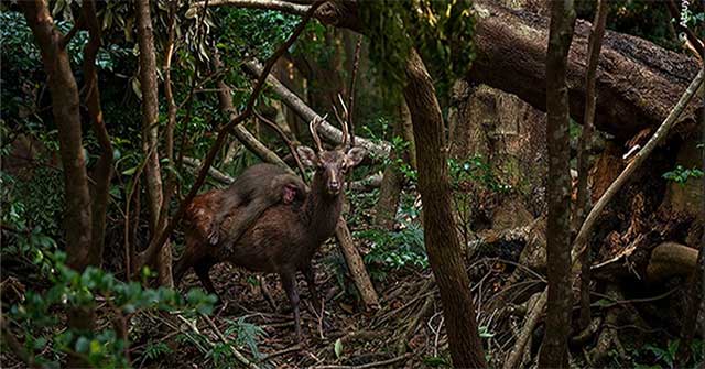 Khoảnh khắc khỉ cưỡi hươu đi dạo chơi. (Ảnh: Atsuyuki Ohshima).